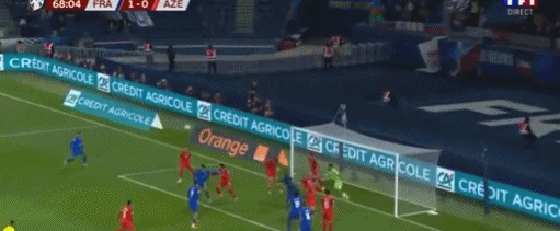 第25分钟,法国获得角球,奥利塞选择直接旋向球门,马哈马达利耶夫飞身单掌将球托出横梁。第43分钟,埃基蒂克潇洒人球分过杀入禁区,小角度劲射打得太正,被阿塞拜疆门将没收。